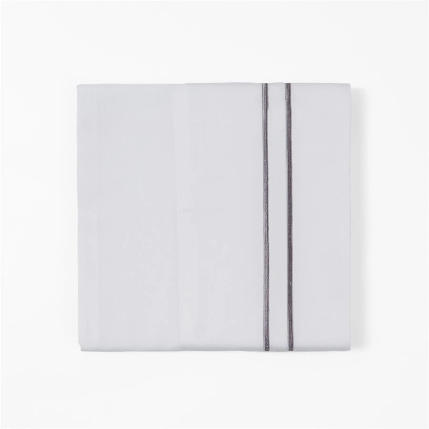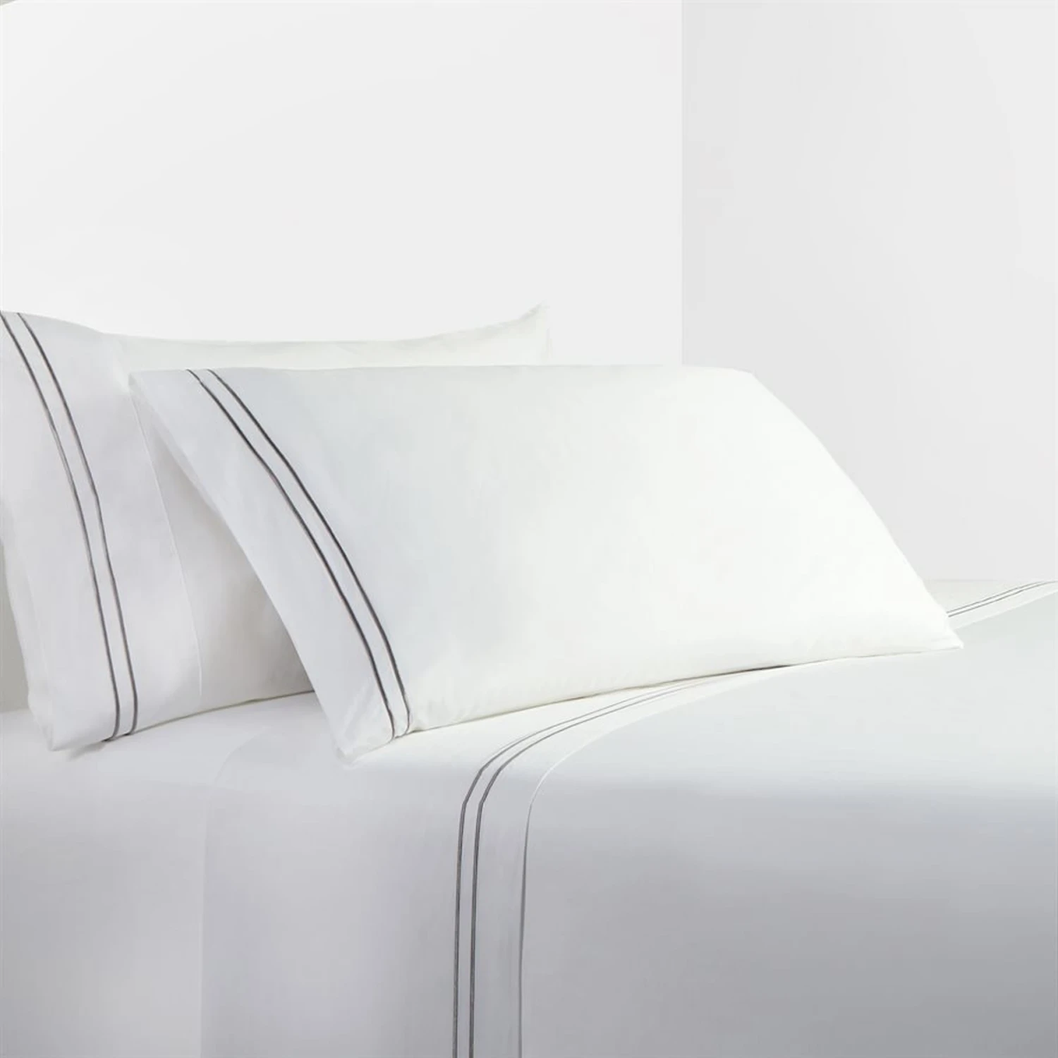 This set of crisp white sheets is embellished with two elegant stripes of raised gray embroidery, adding sophistication and ensuring versatility. The 350TC adds to a satin like softness for comfort and style. Elevate your sheets experience with this gorgeous four piece sheet set that will lend luxury and refinement your bedding ensemble.