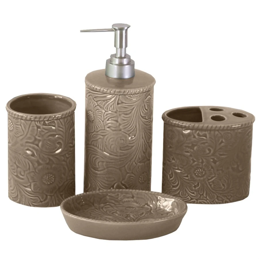 This stunning four piece bath accessories set is an extension of the popular Savannah collection which features a swirling floral pattern with a damask flair, designed to look like hand tooled leather.
