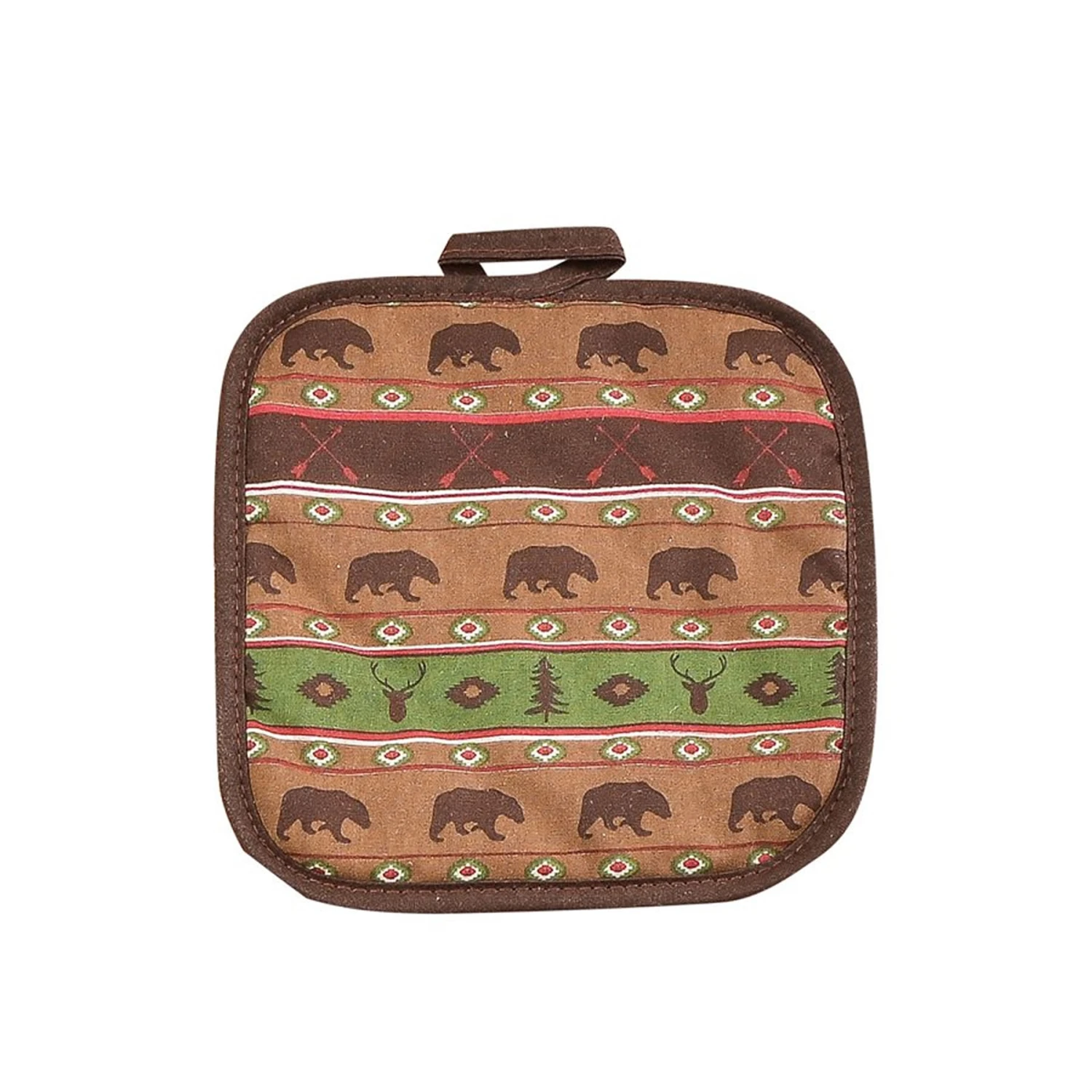 Warm you kitchen with our Aztec animal print pot holder in rich outdoorsy hues of brown, forest green and deep red. Pair with the oven mitts and tea towel for that huntsman look.
