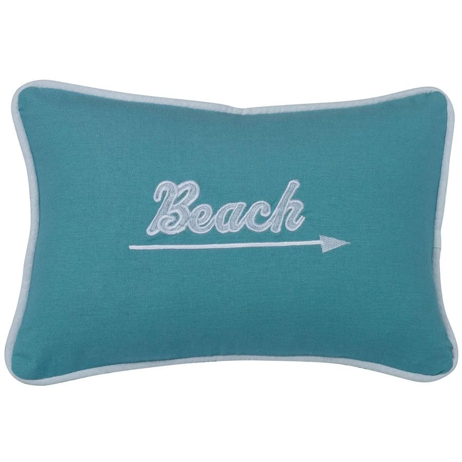 Beach script embroidered pillow. This pillow features a white beach script embroidery on an aqua linen weave fabric by HiEnd Accents.