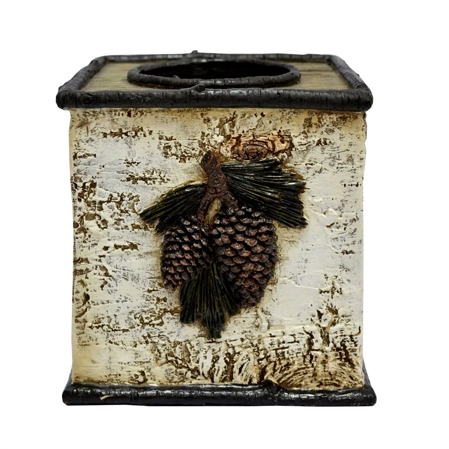 The birch pine cone tissue box is made of resin with raised pine cone motifs on a tree bark background texture. Coordinates with several rustic, lodge and mountain collections.Â