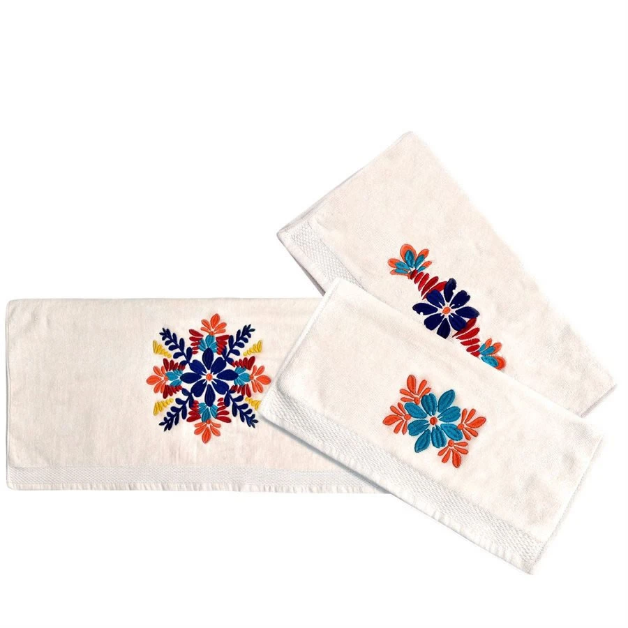 Add a Southwestern touch to your bathroom with the Bonita Bathroom Set. Inspired by classic Talavera pottery, the beautiful floral pattern is here embroidered on a soft cream towel for an elegant addition to your bathroom. Velvety velour reverses to a terry for a soft feel and added absorbency, detailed with a textural dobby. The bright, colorful shades of blue, orange, and turquoise are paired together for a unique, yet versatile color story.