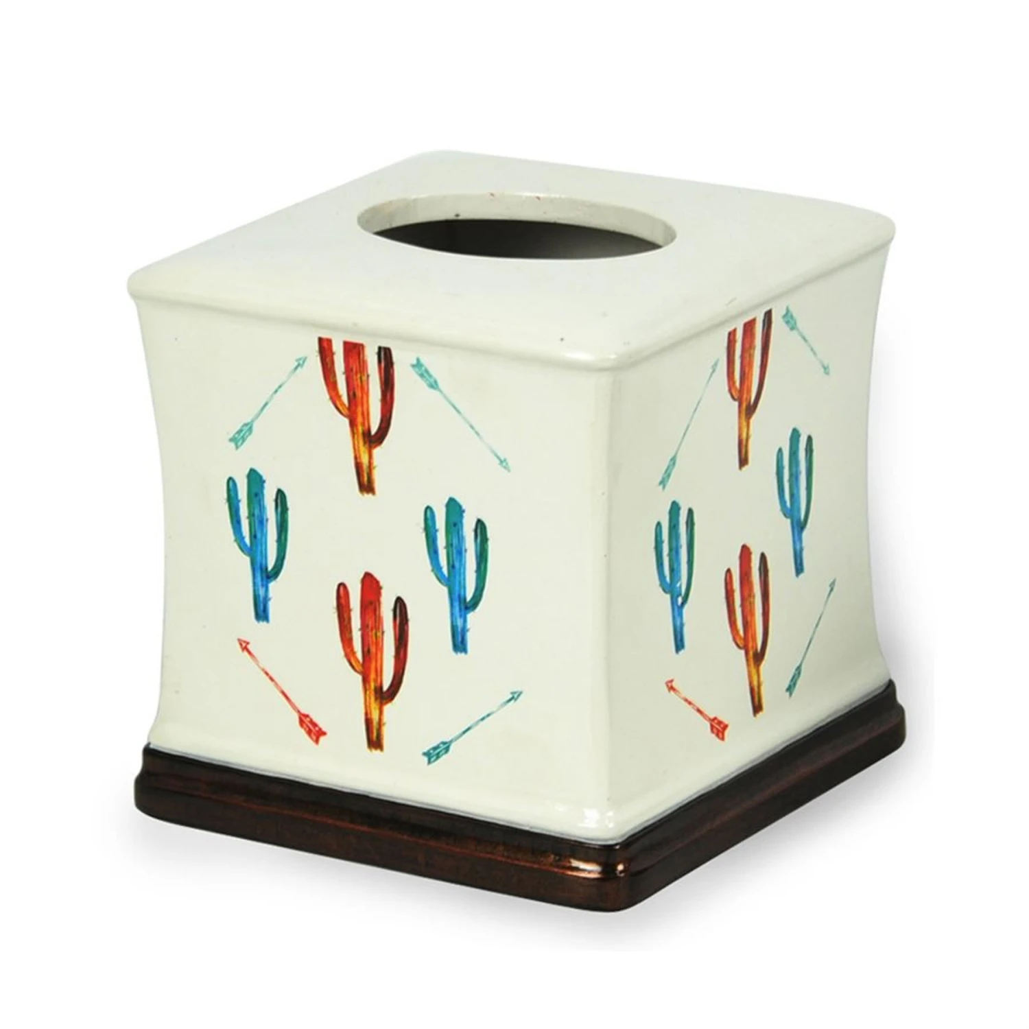 This Cactus Tissue Box will add a fun bohemian feel to your bathroom. Tissue box is adorned with turquoise and coral Saguaro cacti and arrows.