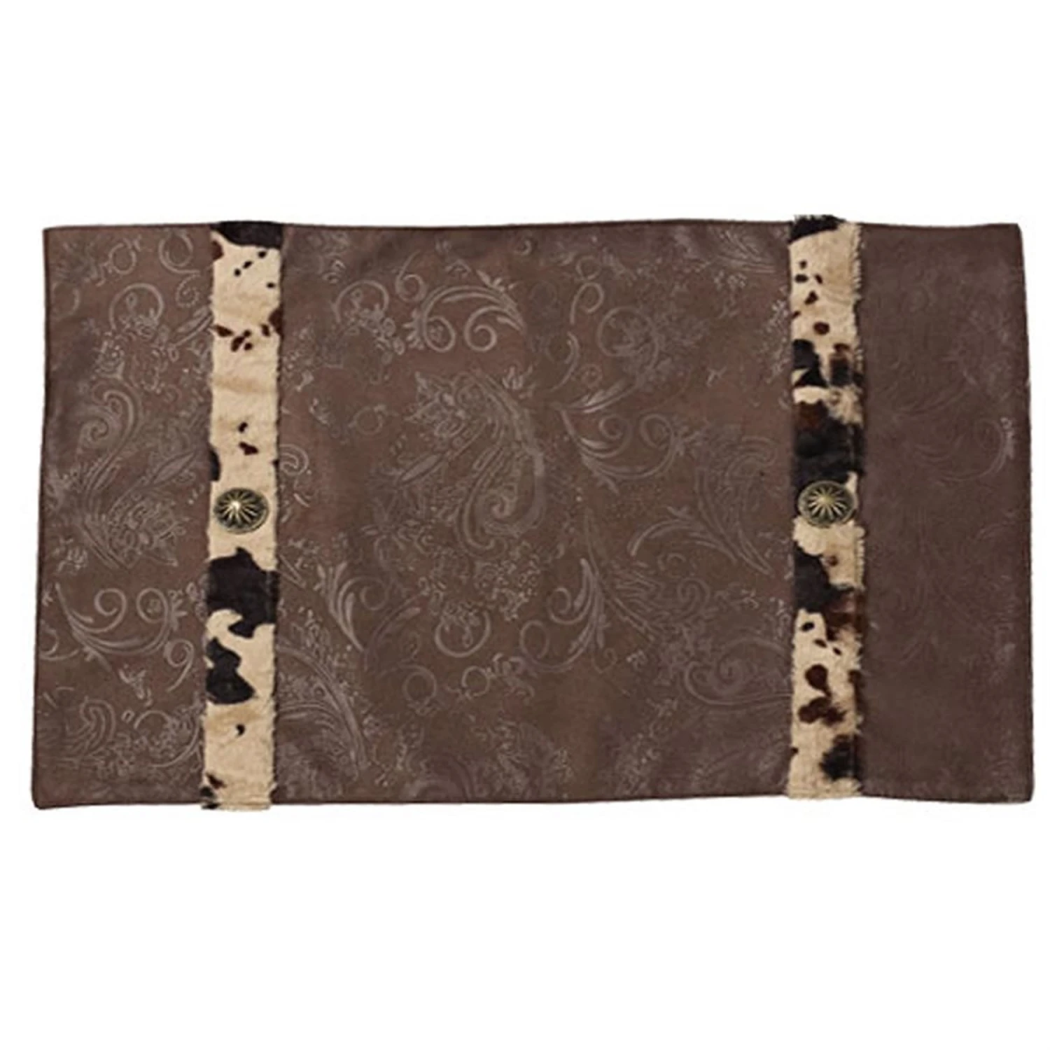 This Caldwell placemats feature a rich chocolate faux tooled leather surface complemented with a cowhide printed velvet accent. Stylish Conchos provide a note of western finishing.