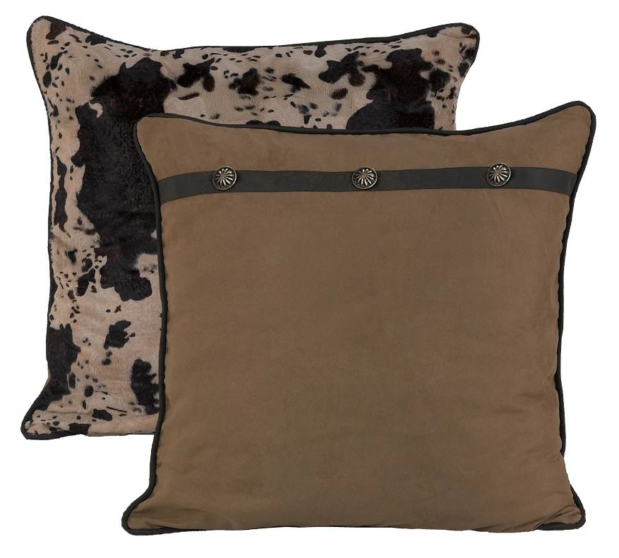 Faux Cowhide on one side and mircofiber suede on the other. Accented with chocolate brown piping and silver conchos.