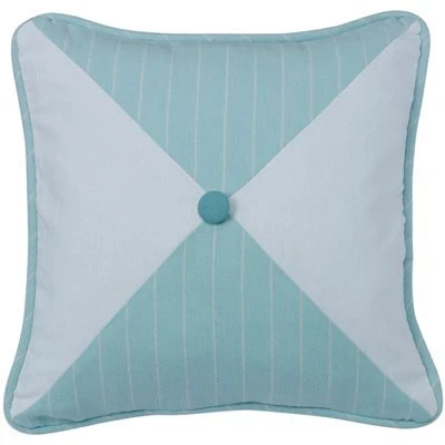 Catalina reversible square accent pillow features pieced subtle blue and white stripe and solid white matelasse with button detail. Reverses to aqua chevron print by HiEnd Accents.