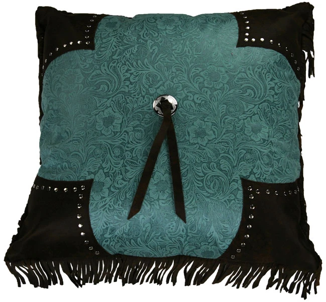 Designed for the Cheyenne collection, this rich Turquoise faux leather accent pillow works great in any western setting. With detailed tooled faux leather, Chocolate Brown faux leather corners, Silver studs and stylish faux leather fringe, the pillow is finished with a center silver Concho. Studs are embedded into the fabric for durability, not glued.