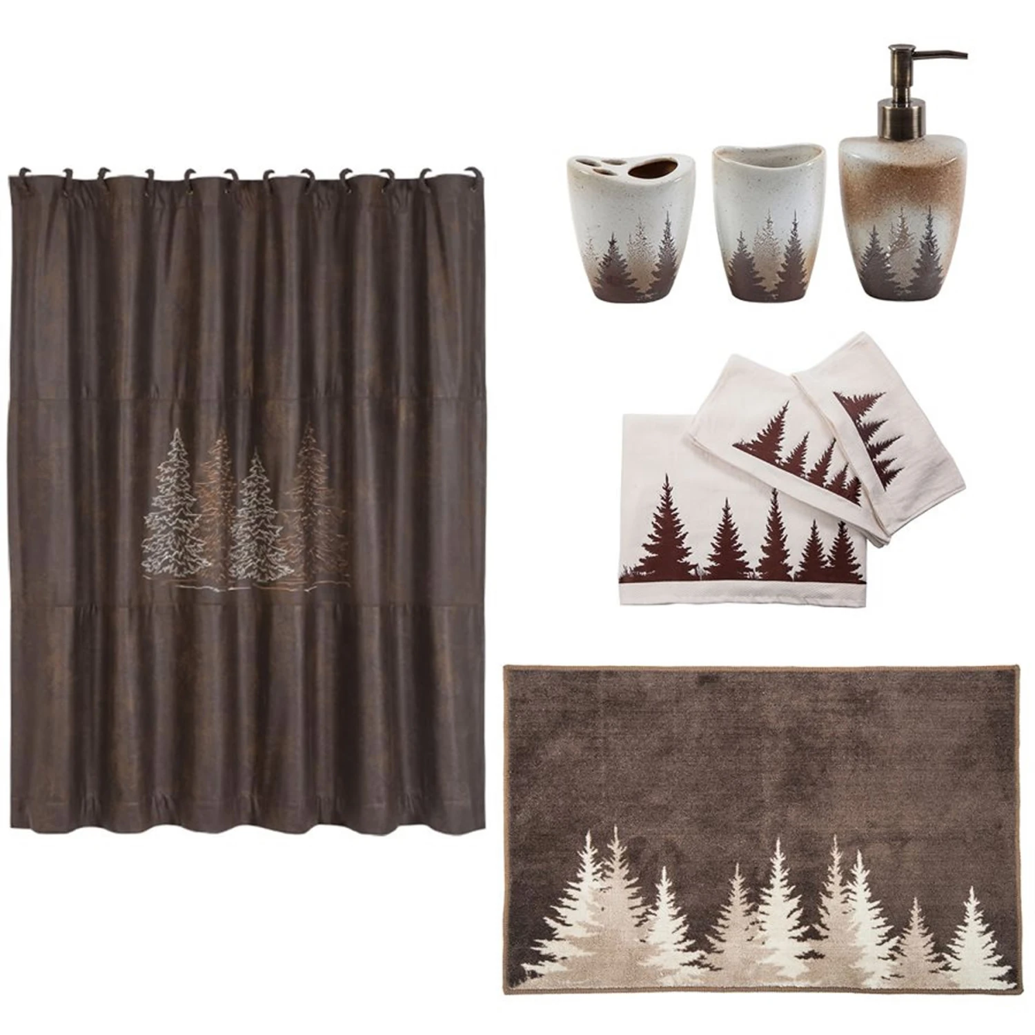 Shadowy pine tree silhouettes will evoke a calming, peaceful presence in your bathroom. The 20-Piece Clearwater Bath Collection has everything you need to decorate your bathroom! The set includes: (1) Clearwater Pines Shower Curtain, (12) Fabric Covered Shower Curtain Rings, (1) Clearwater Pines 3-Piece Bath Towel Set, (1) Clearwater Pines 3-Piece Bathroom Set, (1) Clearwater Pines Bath Rug.