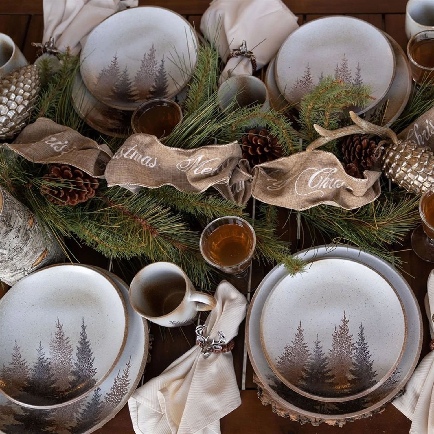 Shadowy pine tree silhouettes on cream speckled stoneware evokes a winter forest feeling for your table.Â
