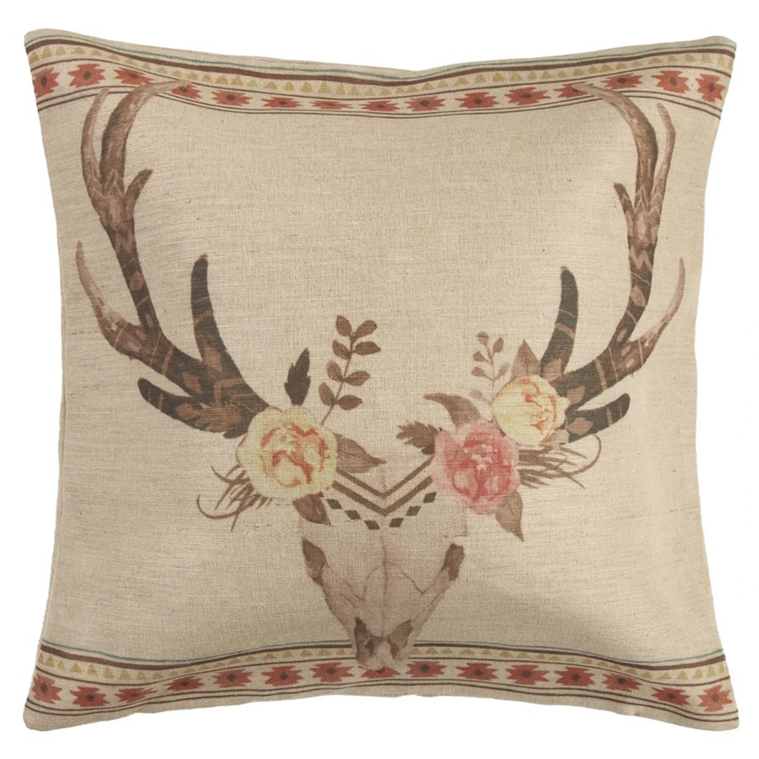 Add southwestern flair to your home with the burlap skull with flowers pillow. Burlap fabric blends in well with many décor styles.