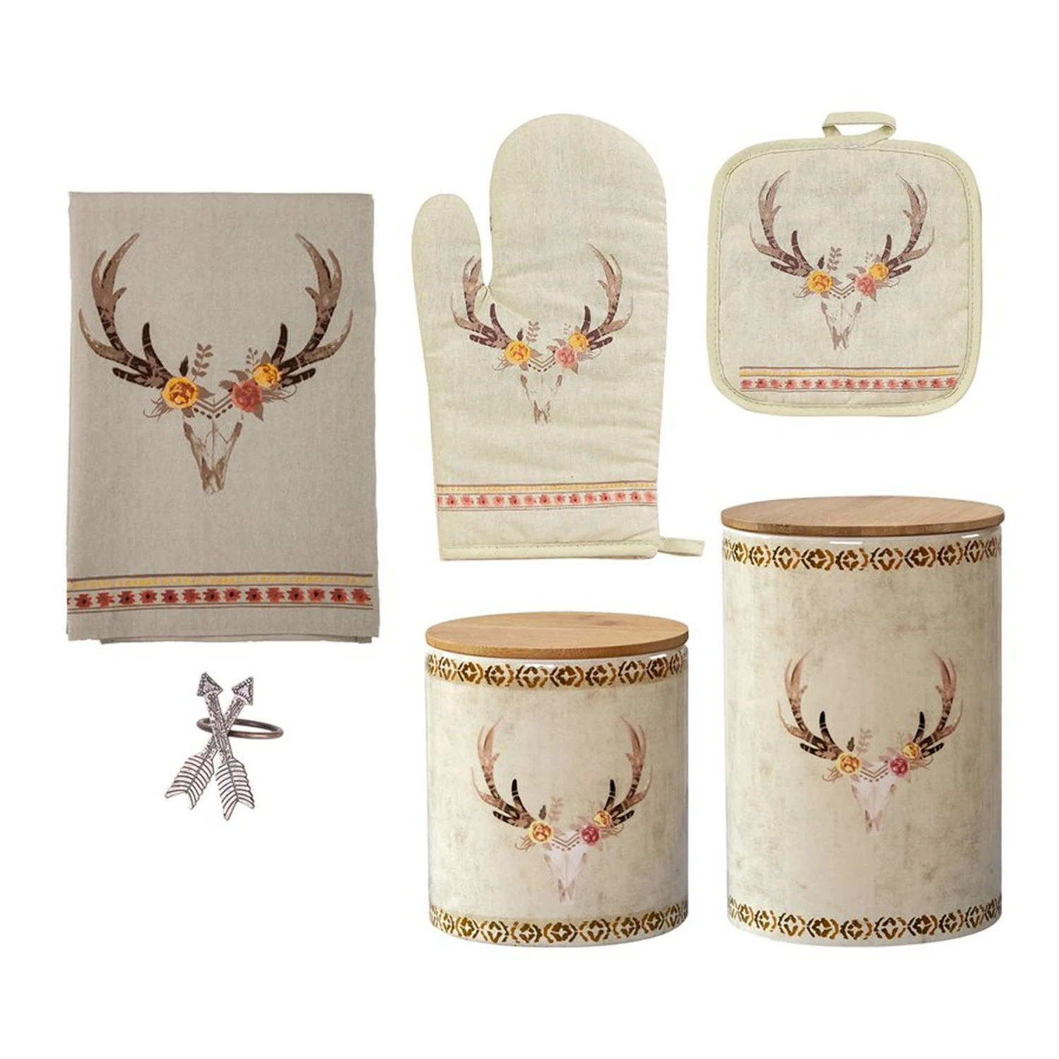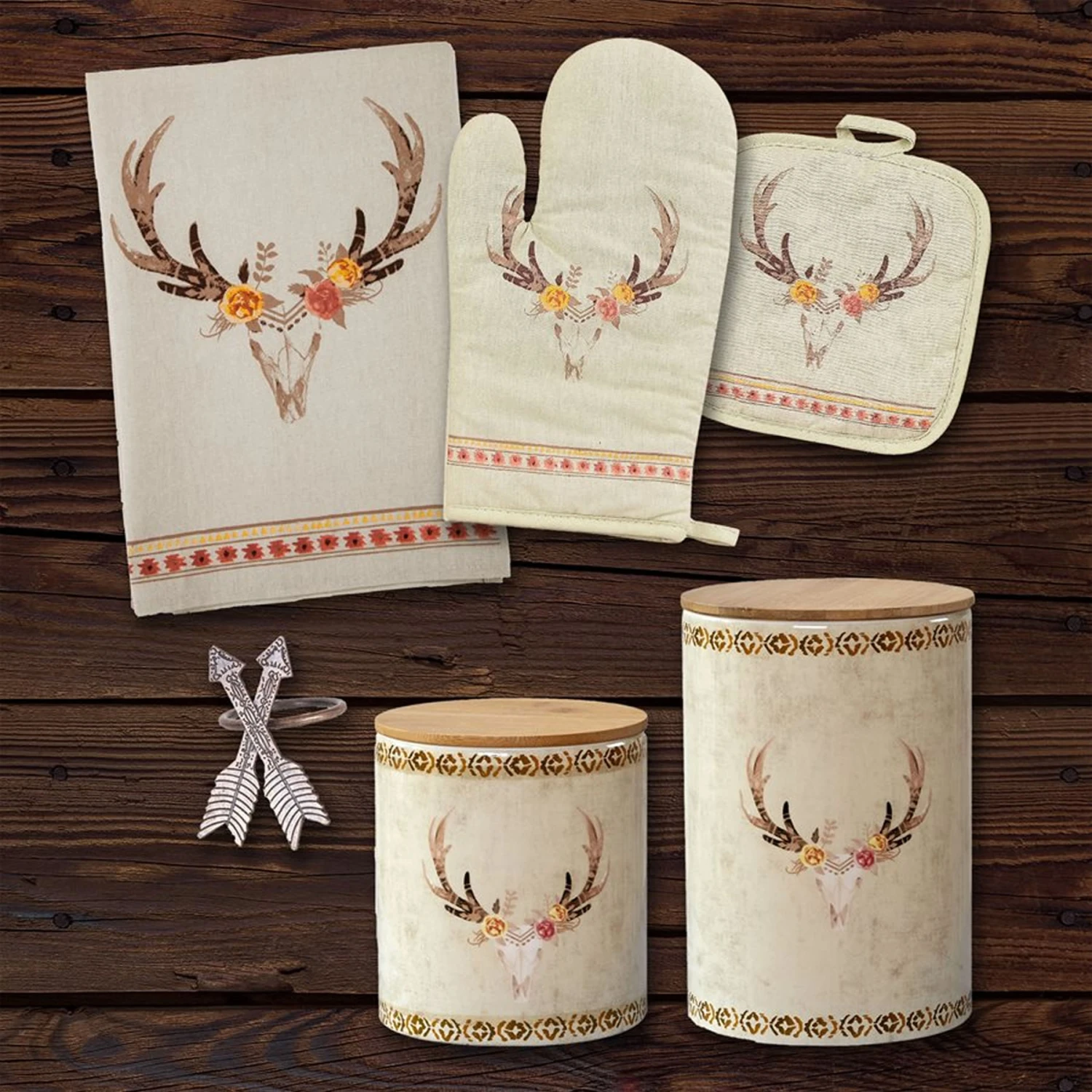 The Desert Skull 18 Piece Set includes: (2) Desert Skull Canisters, (2) Desert Skull Oven Mitts, (2) Desert Skull Pot Holder, (6) Desert Skull Tea Towels, & (6) Arrow Napkin Rings.