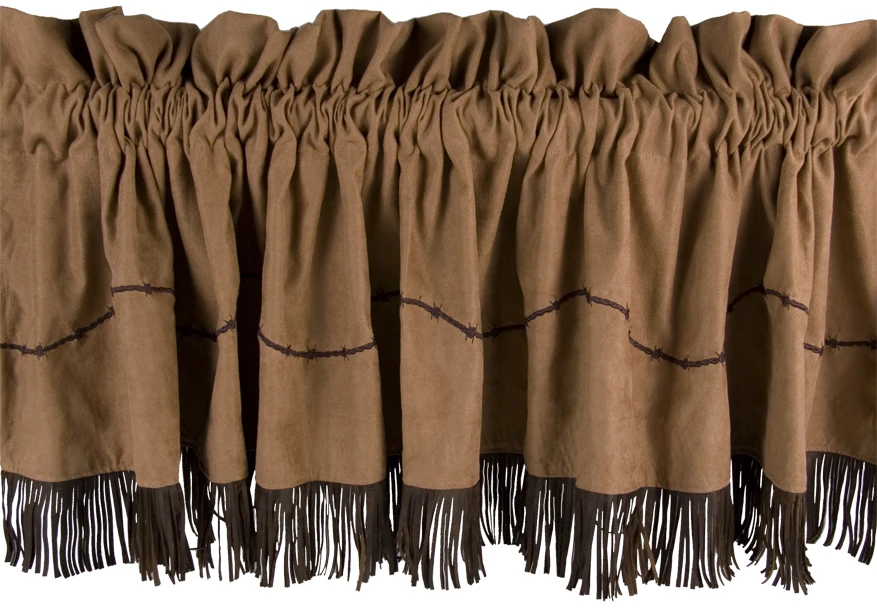 The barbedwire valance is sewn on tan faux suede with chocolate embroidered barbedwire detailing. Stylish faux suede fringe frames your window treatment in subtle western elegance. A tasteful gathered heading above the rod pocket provides easy and stylish hanging. Designed to compliment a variety of western collections, coordinating accessories are available separately. Matching curtains sold separately.