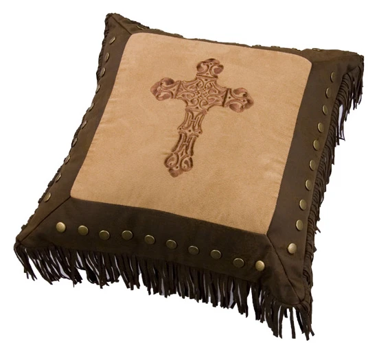 Luxury square embroidered cross pillow by HiEnd Accents. Dark Brown faux leather with studs and Dark Tan with embroidered cross detail and fringe.