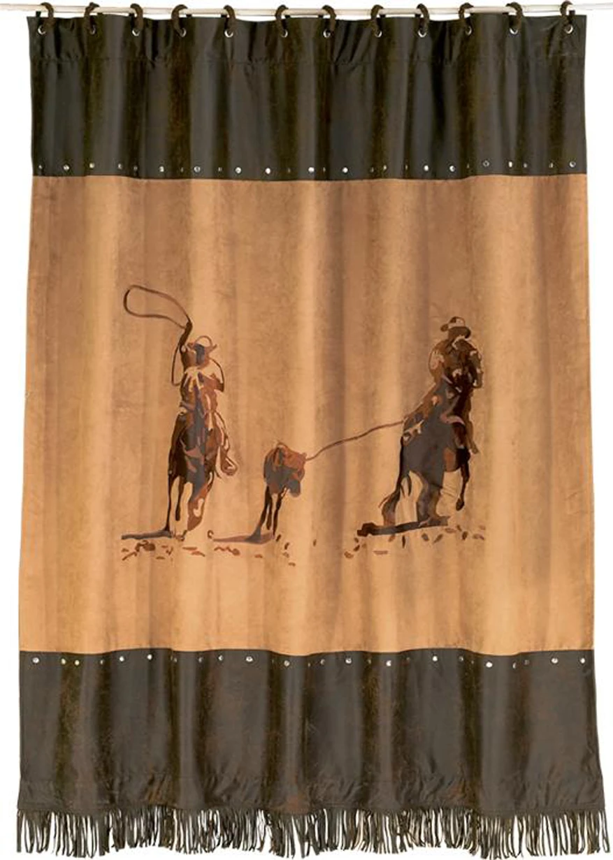 Luxurious shower curtain embroidered with team roping by HiEnd Accents.