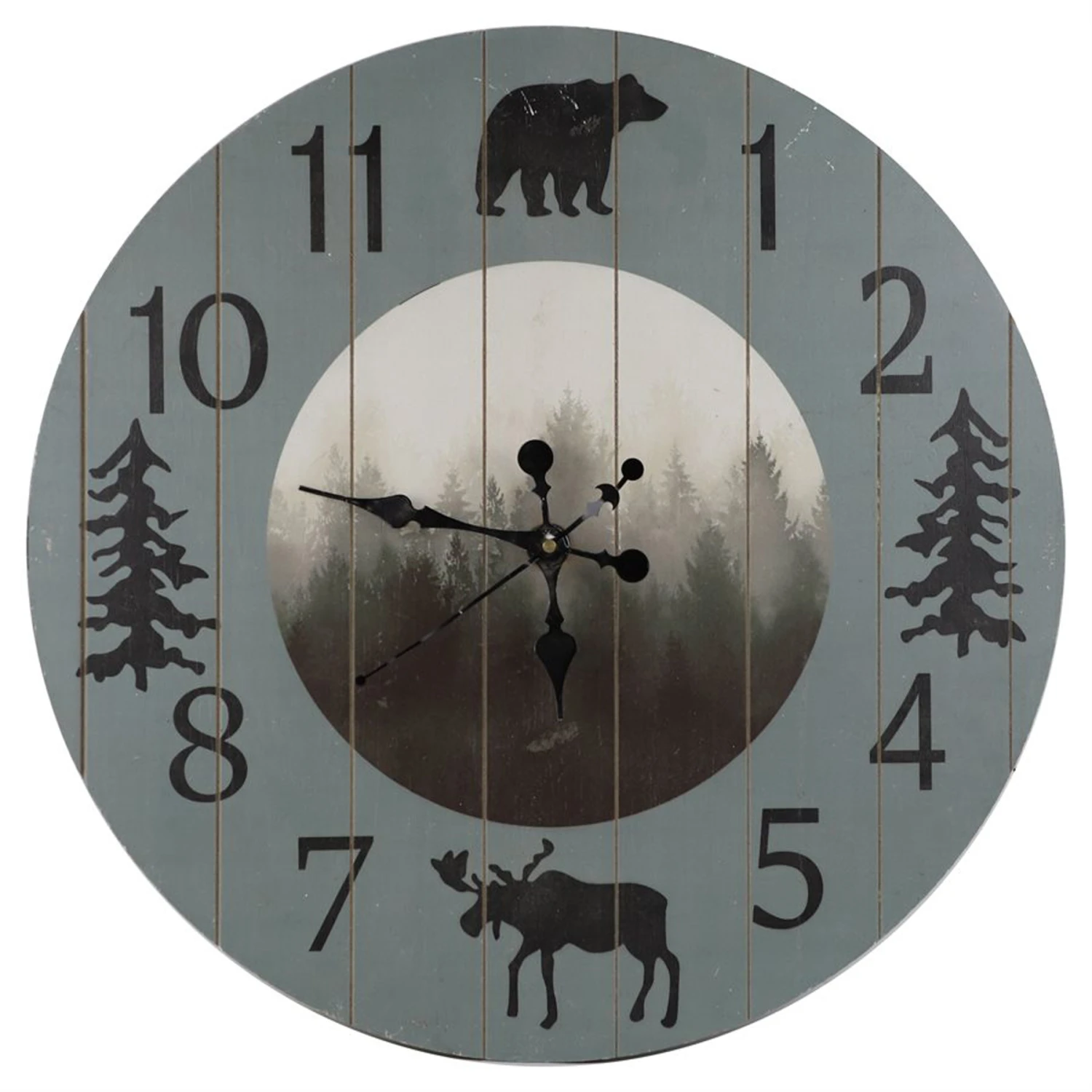 Add a cool rustic tone to your space while also getting to remember the time. This clock brings the glow of dusk into your home. The foggy forest scene is surrounded by tree and animal silhouettes alongside the numbers. The ashy blue is a perfect color to tie into and cool down an earthy palette. The classical clock hands are balanced by exposed paneling of the wood, also adding vertical interest to the circular wall decor. Perfect for a cabin, or bringing that same mood into your everyday home.Â