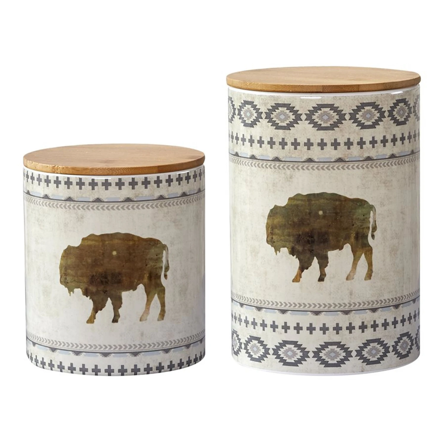 Add a southwestern flair to your kitchen with these Free Spirit Canisters. Decorated with Aztec and buffalo elements, they bring to life a bohemian kitchen. The sizes and shape works well for anything you might need to keep on hand. Add them to your kitchen counters to bring the room together with a homey touch. With shades of cool cream, grey, and brown, and hints of icy blue, itβs a whole new take on southwestern design. The bamboo lids are fitted with silicone gaskets for a snug fit, keeping food fresher.