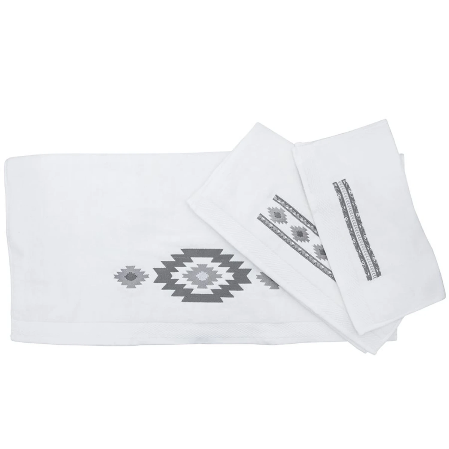 Complete your Bohemian bathroom with the Free Spirit towel set. The gray embroidered designs give each a southwestern flair in unique, modern style. 100% cotton, white velour reverses to a terry for a soft feel and absorbency.Â
