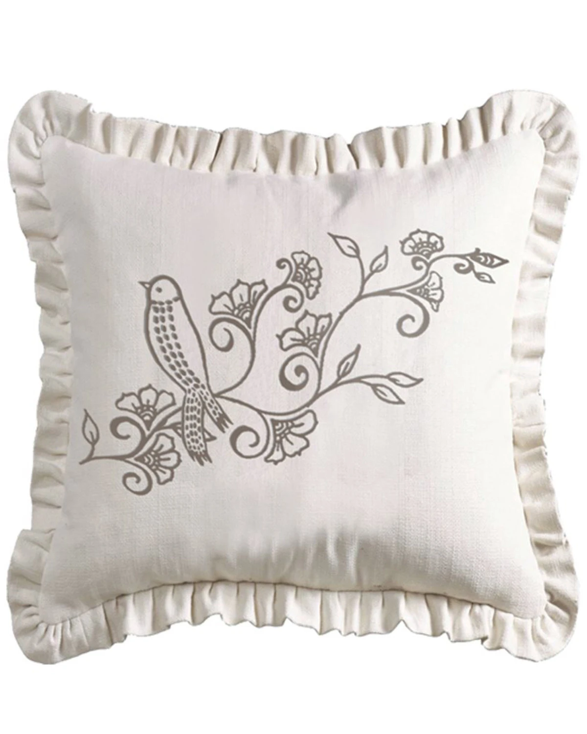 Add sophistication and elegance to any bedroom set, sofa, or armchair with our HiEnd Accents pillow. This pillow features ruffled trim, soft white linen fabric, and beautiful, intricate bird and floral embroidered detailing. Measures 20″ x 20″.