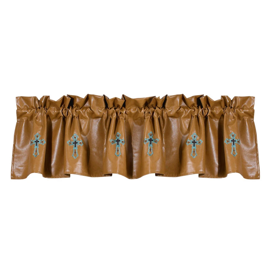 This one piece Las Cruces coordinating valance features a beautiful turquoise multi cross design on supple tan faux leather. This valance is constructed with a gathered heading above the rod pocket, which provides easy and stylish hanging. Designed to complement a variety of western collections, coordinating accessories are available separately.