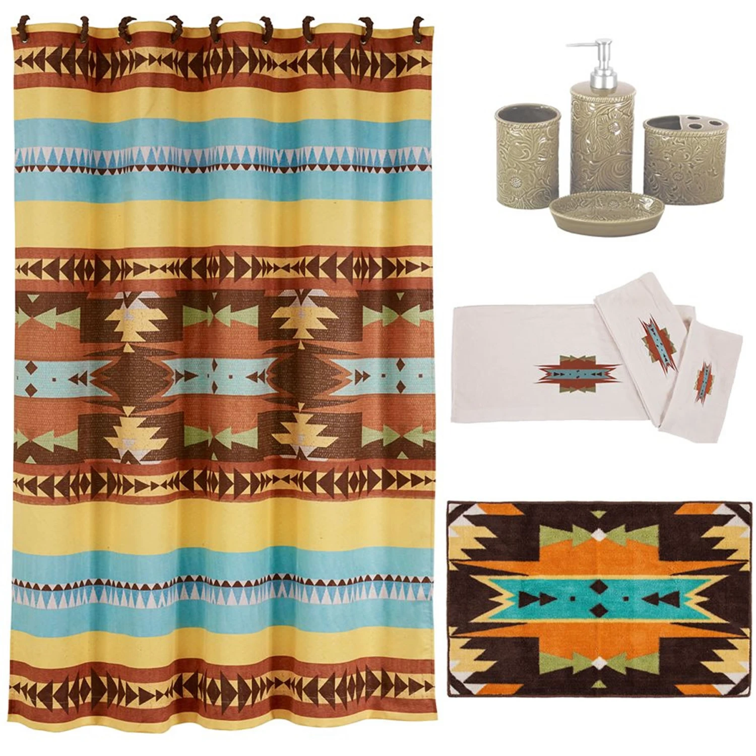 Brighten your bathroom with the Mesa Bath Collection! The 21-piece set includes: (1) Mesa Shower Curtain, (12) Fabric Covered Shower Curtain Rings, (1) Mesa 3-Piece Bath Towel Set, (1) 4-Piece Savannah Bathroom Set, (1) Mesa Bath Rug.
