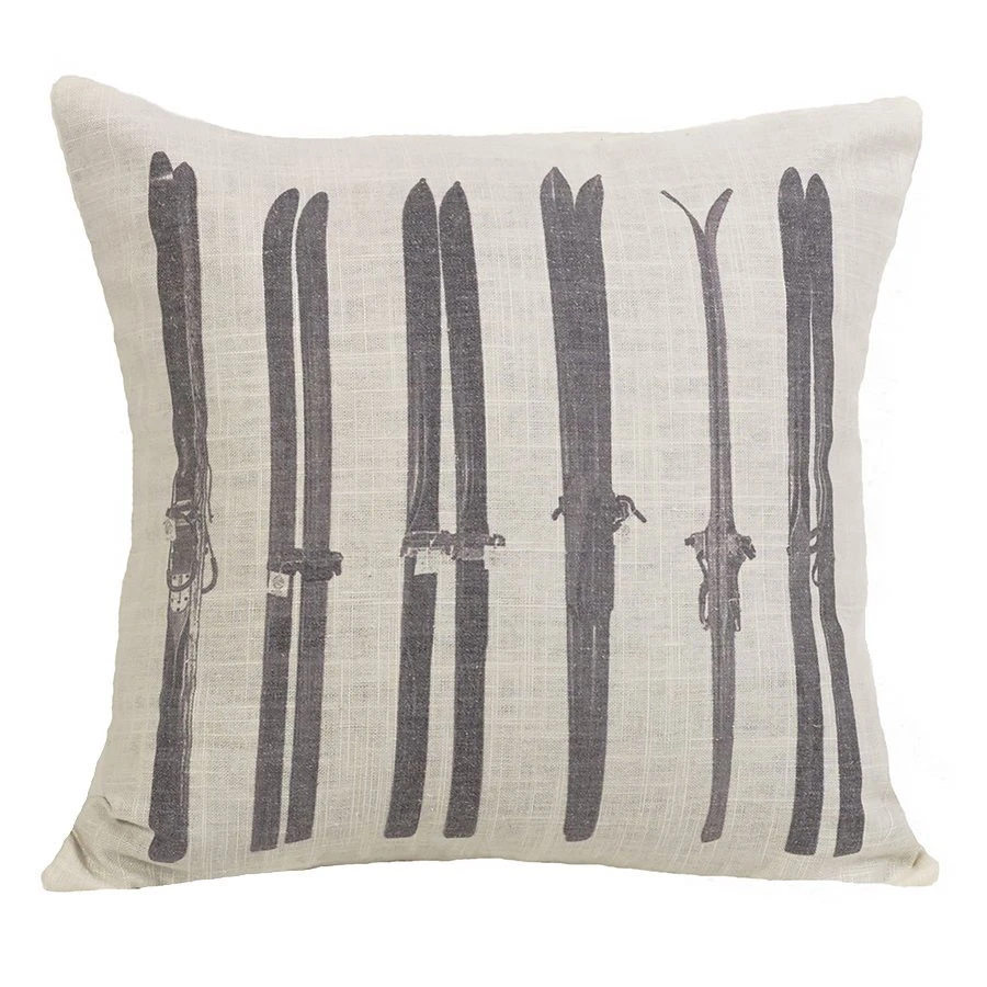 Muted gray snow skis decorate this square accent pillow, making it a fabulous addition to your mountain chalet or ski lodge.