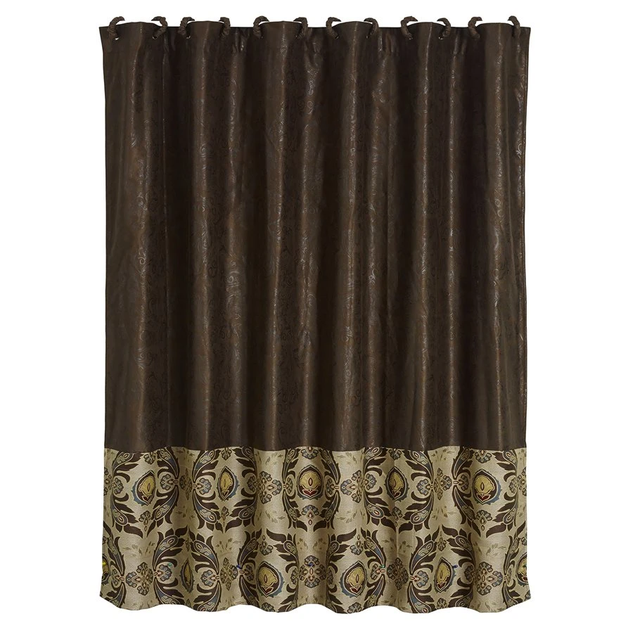 Lovely chocolate faux tooled leather shower curtain features a panel of Loretta fabric at the bottom. Includes 12 coordinating fabric covered shower curtain rings.