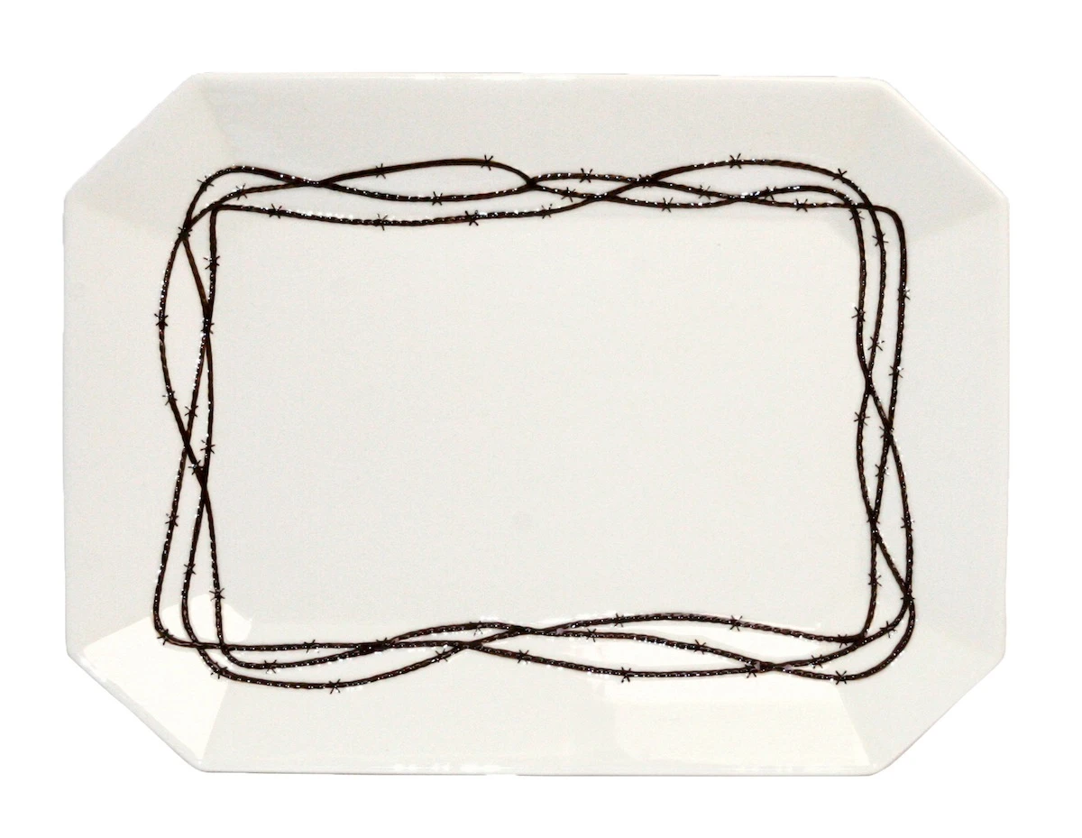 Cream stoneware with chocolate Brown rustic barbed wire design. Oven, microwave and dishwasher safe. 16â…œ” x 12â…›”