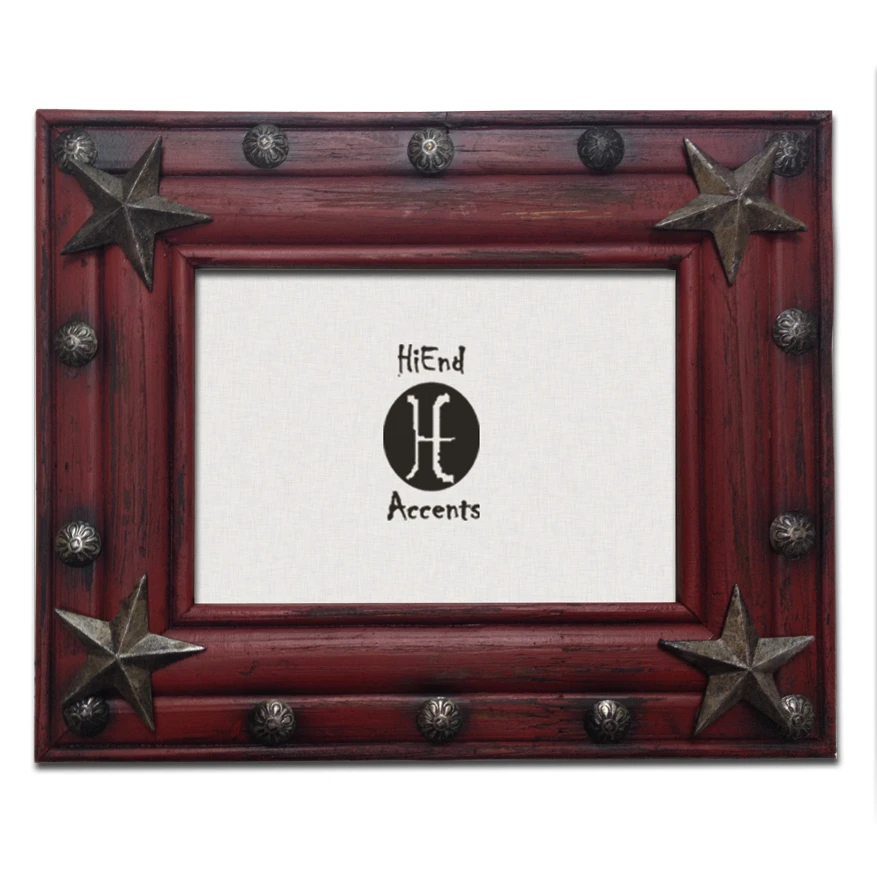 Red painted distressed wood 5×7 frame with rustic stars and tacks creates a western inspired look for any room.
