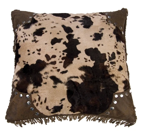 This decorative pillow features faux cowhide fabric with brown faux leather scalloped corners, finished with silver studs and fringe. A wide variety of coordinating accessories are available sold separately.