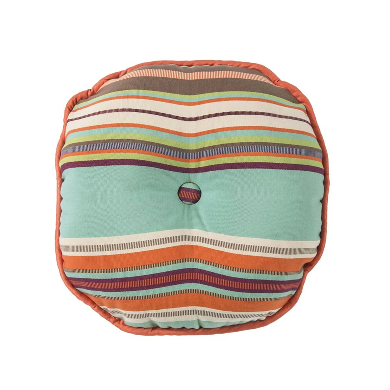 Designed for the Serape collection, this tufted round accent pillow is constructed from turquoise, burgundy, sunset orange and chocolate striped fabric. Edge with faux orange piping, a center button completes the piece.