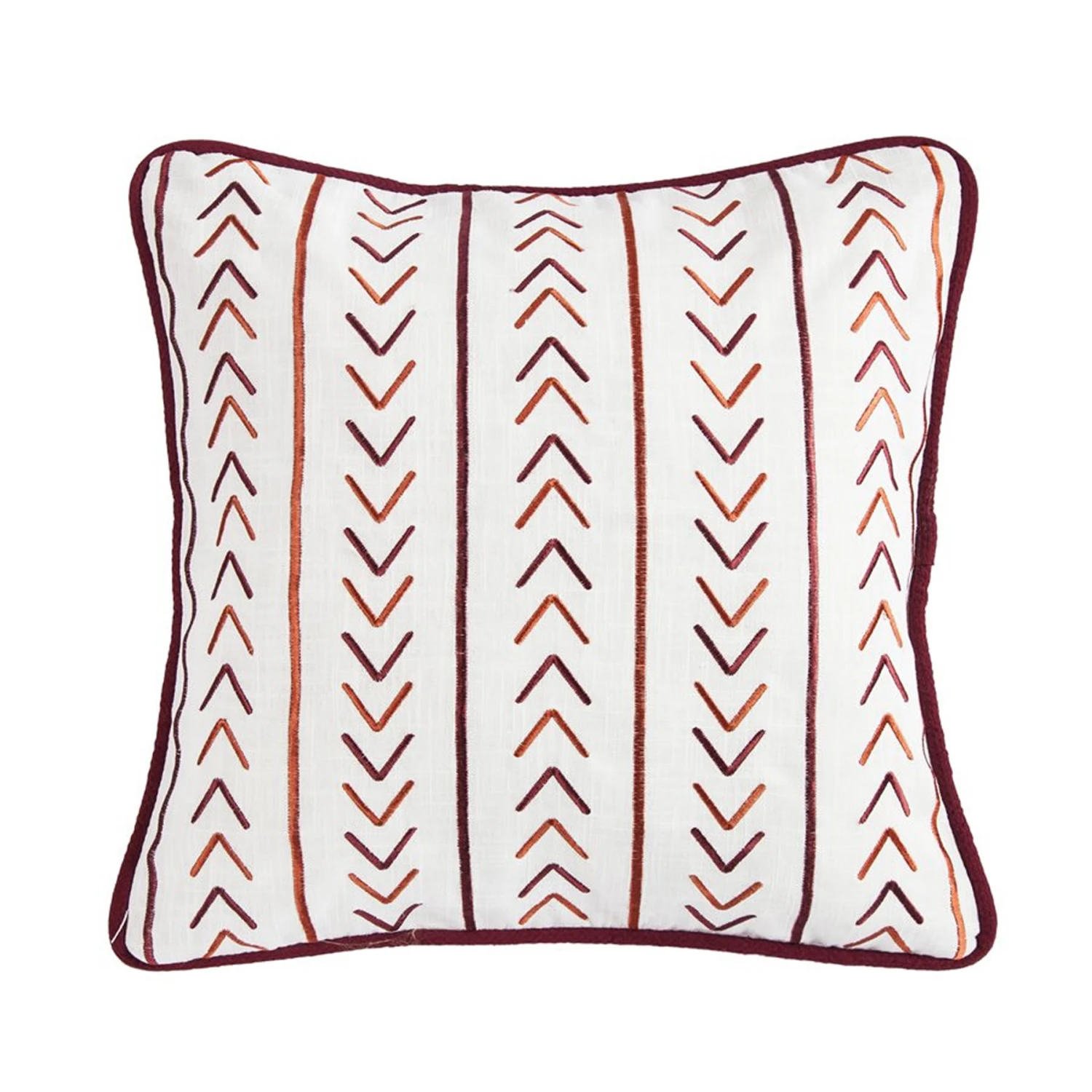 Part of the Solace collection, this white linen pillow has embroidered ombre thread stripes and arrows.