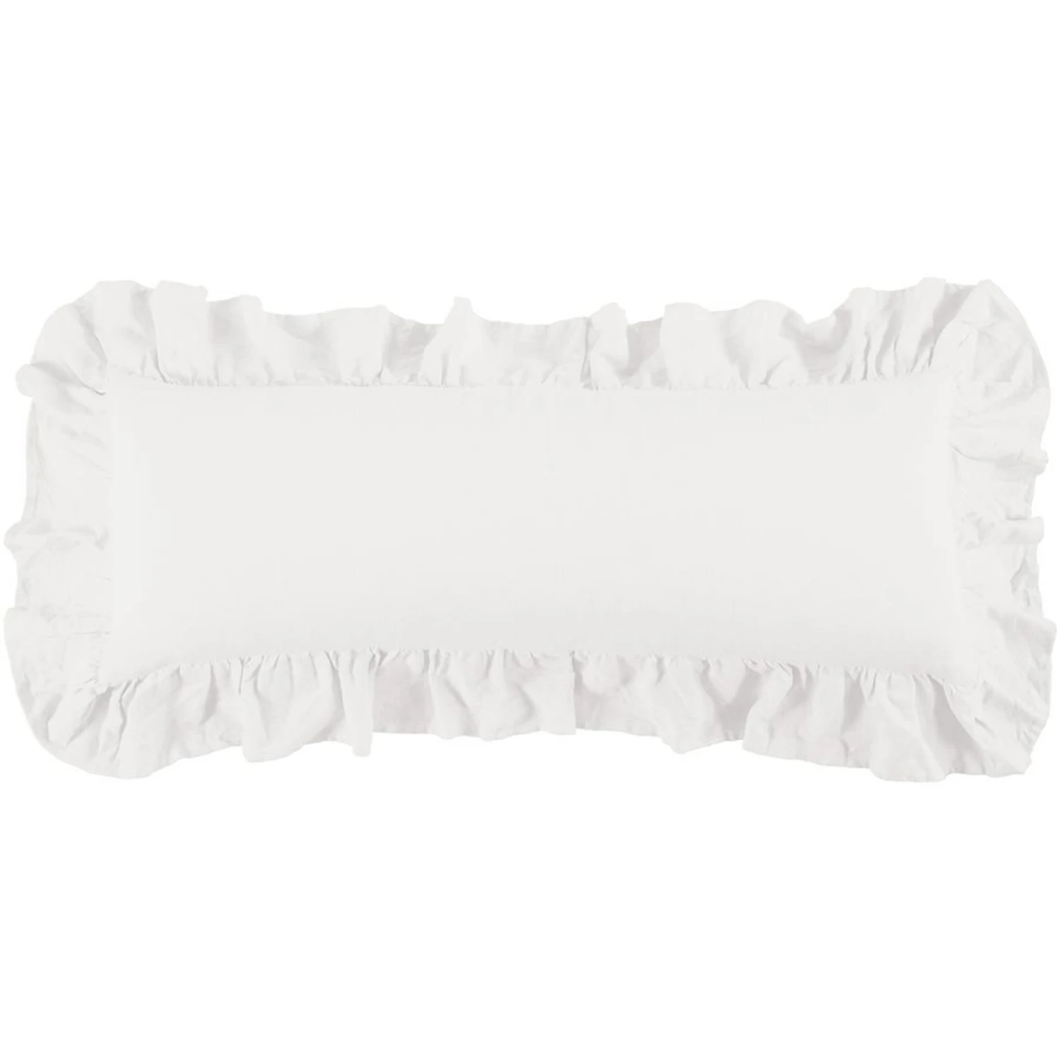 Add the essence of relaxed tranquility to your bedroom with the Washed Linen Ruffled Body Pillow in White. Oversized ruffle completes the look by adding a soft feminine detail.