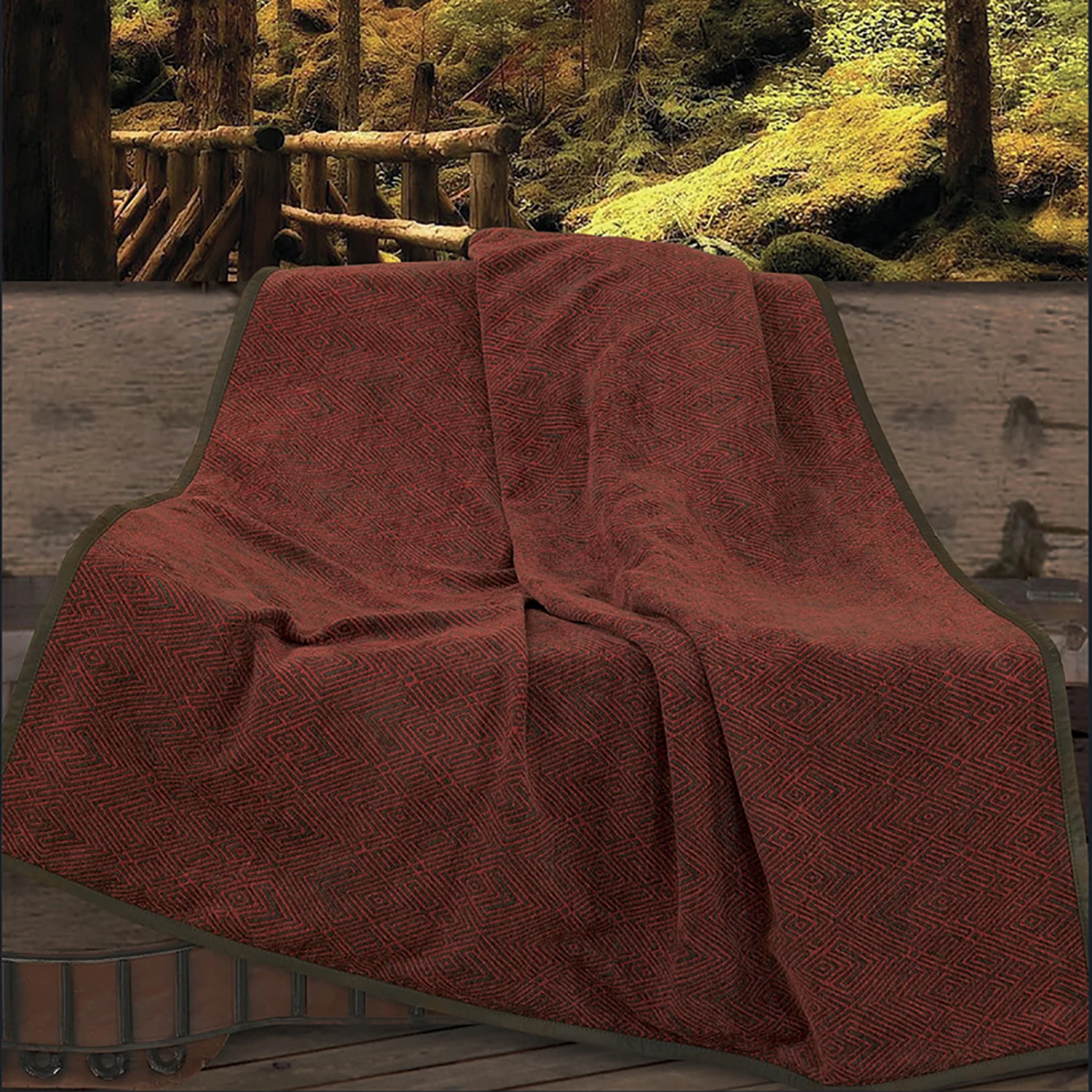 This coordinating Wilderness Ridge throw is made of a soft red and brown cut chenille accented with a brown faux leather trim.