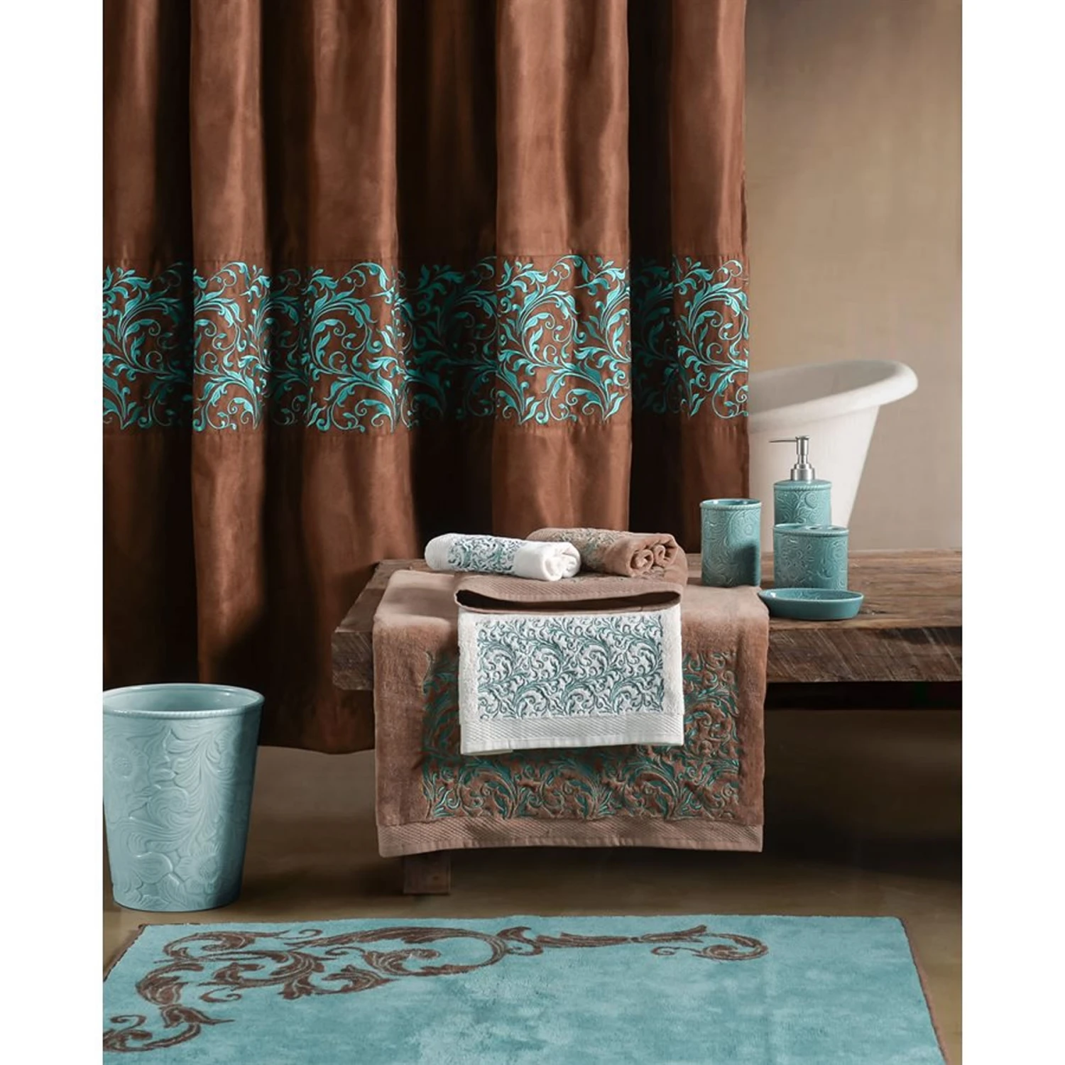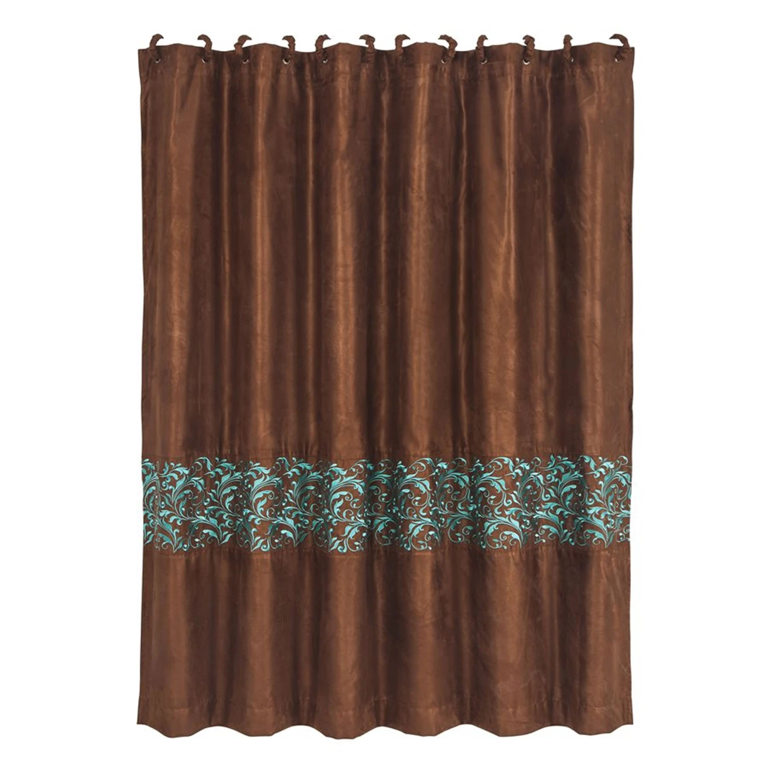 Beautiful copper taffeta-style shower curtain with exquisite turquoise scroll-work banding.